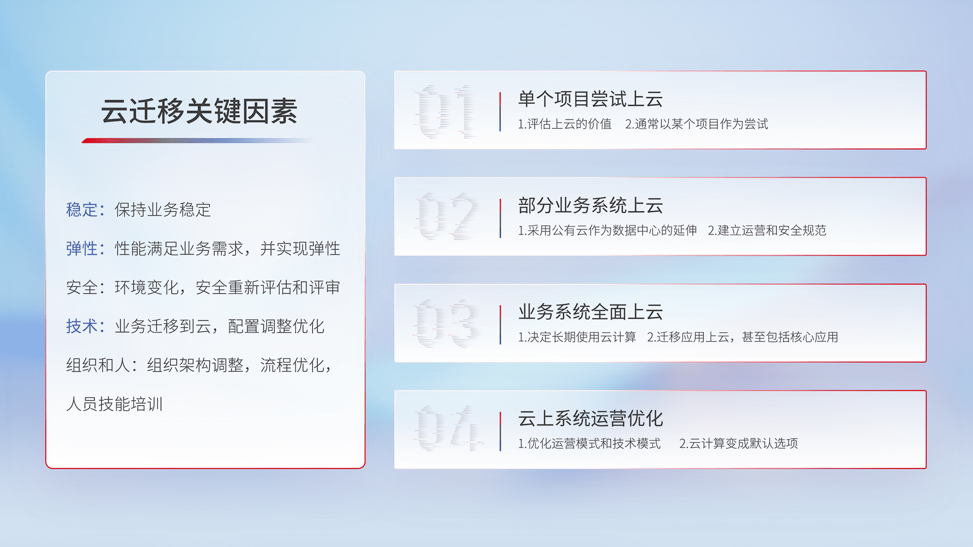 结合实际业务,,,,从规划设计、、云平台选型、、、、云原生改造、、、数据迁移、、、集成交付,,迁移全过程为客户识别最佳上云路径,,,做好风险识别管理,,,,设计网络架构、、身份权限、、安全审计合规、、操作审计、、、日志审计、、、、监控告警策略、、多站点容灾设计等,,对云上基础设施进行整体规划,,提升IT治理水平,,以满足弹性、、、高可用、、、高性能的需求。。。。