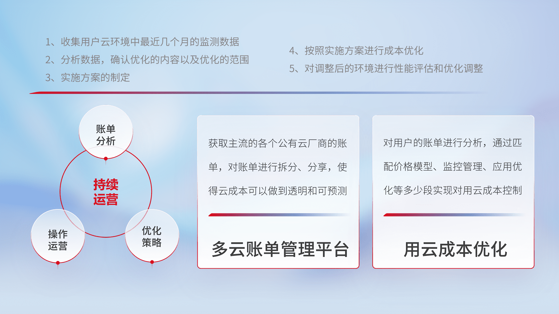 通过灵活运用多种自动化迁移工具,,,帮助企业用户实现业务和数据高效 、、稳定的上云迁移和云上迁移,,,,采用自研多云纳管平台,,以中立管理模式,,解决多组织、、、多云、、、多运维厂商的复杂关系的管理,,保证多云平台资源配置的一致性,,,,实时掌控云资源运行数据,,,,运用智能化工具分析云资源多云平台的管理服务,,透明化管理成本支出,,,,用云成本可预测、、、、用云费用可优化、、云资源配额有据可依。。。