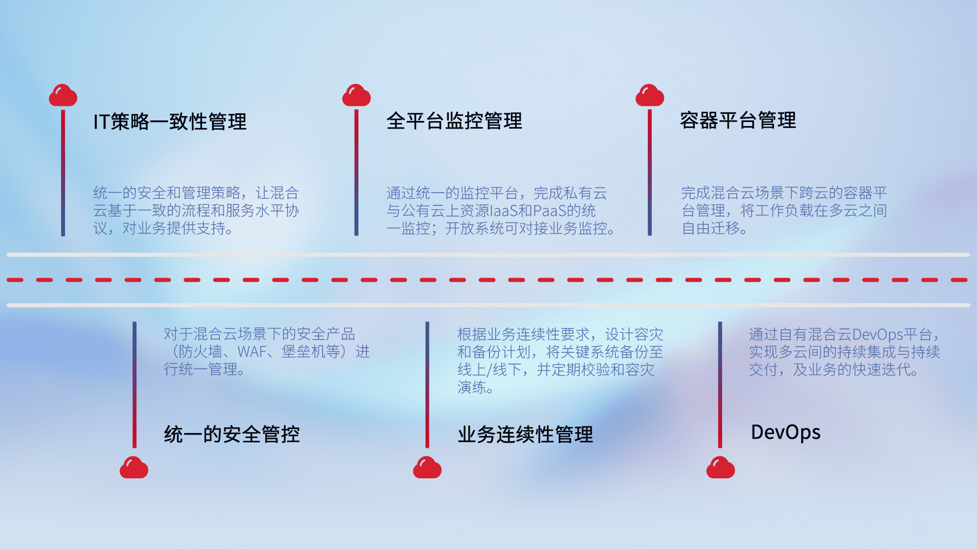 通过多云纳管,,,,以统一的资源数据模型把客户的云资源进行抽象和封装,,进而实现对多云资源的统一操作,,保障云资源管理的可靠性、、稳定性与可用性。。。。量身定制化运维内容,,配置、、、、开发运维、、补丁管理、、备份、、、监控、、认证和访问管理、、审计和日常巡检等,,保障在用云过程中的可靠度,,,,稳定度以及高可用率。。