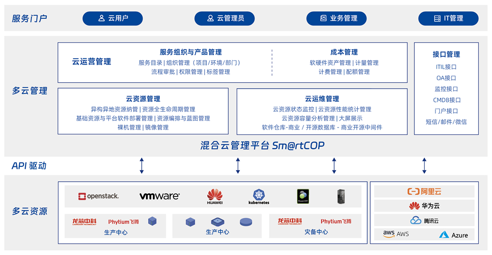 面向各行业用户多云资源管理、、运维及服务提供的综合挑战,,提供异构异地异芯片多云资源的统一管理、、、统一运维、、统一监控及统一运营服务,,简化多云管理复杂度,,,提升用户用云满意度,,,,释放云平台业务价值。。。