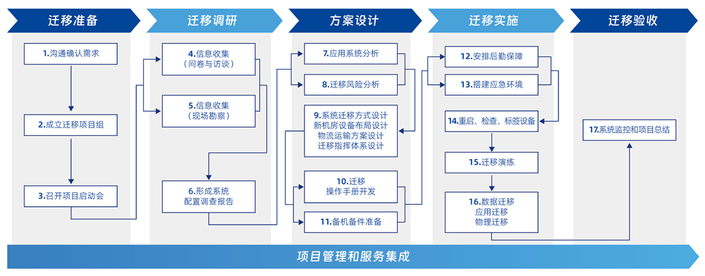 帮助客户进行数据中心的各类迁移服务,,,,包括传统数据中心及新一代云数据中心的 IT 基础设施设备迁移、、系统迁移、、、数据迁移、、、、应用迁移、、、同城灾备/双活、、、、异地容灾等各类场景迁移。。。设备包含主机、、、存储、、、、网络、、、服务器、、云平台、、、数据库、、中间件、、、应用、、灾备系统等各类软硬件。。迁移服务通过制定迁移策略和计划,,组织高效、、、、准确地执行迁移,,,并在既定等停机窗口内完成数据中心的搬、、迁、、、建、、、管、、谋等过程。。 一站式集成迁移服务能力:新一代数据中心规划、、、建设、、、优化、、、、容灾、、、迁移、、、、物流、、、、备件、、、、运维