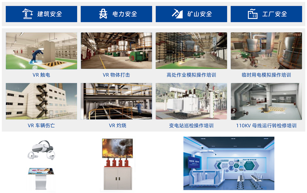 VR 临境式实训安全教育系统,,以现实培训环境为基础,,,,基于沉浸式虚拟互动仿真技术搭建典型行业作业场景,,,让学员置身于各种复杂、、、难度不一的生产虚拟场景中,,在确保人身安全的前提下进行高仿真的模拟培训,,,有效提升学员的应变能力和实操技能,,提升培训效果,,突破时空限制,,,,降低培训成本。。。